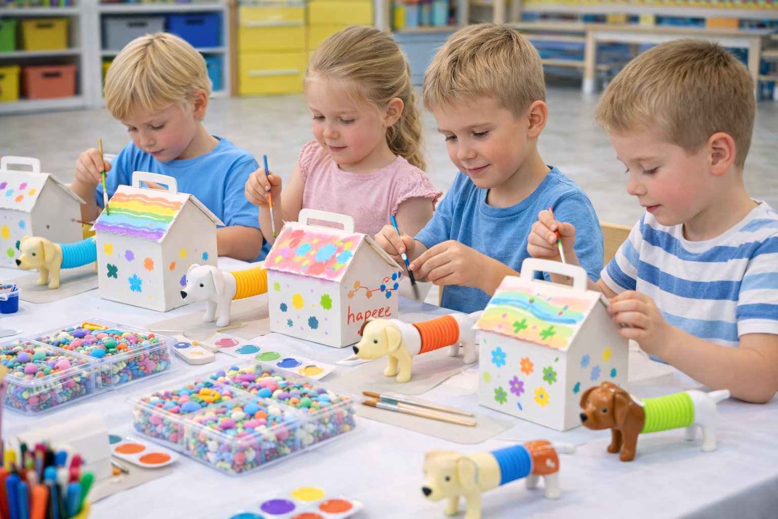 kreatywne warsztaty plastyczne, podczas których dzieci malują i ozdabiają budę dla swojego pieska. Każde dziecko otrzymuje własny zestaw – pieska oraz budę do dekorowania – i tworzy wyjątkowy, kolorowy domek dla swojego pupila. Warsztaty rozwijają wyobraźnię, zdolności manualne i sprawiają dzieciom ogromną satysfakcję, ponieważ na zakończenie zabierają do domu własnoręcznie wykonany domek oraz swojego pieska.