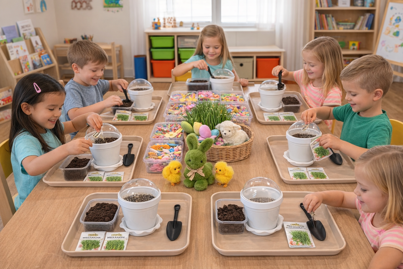 podczas których dzieci zamieniają się w małych ogrodników. Każdy uczestnik samodzielnie zasieje rzeżuchę lub owies w doniczce, nauczy się podstaw pielęgnacji roślin, a na koniec ozdobi swoją doniczkę kolorowymi naklejkami. Gotowa roślinka stanie się piękną, zieloną dekoracją świątecznego stołu, którą dzieci zabiorą do domu. 🌿🐣