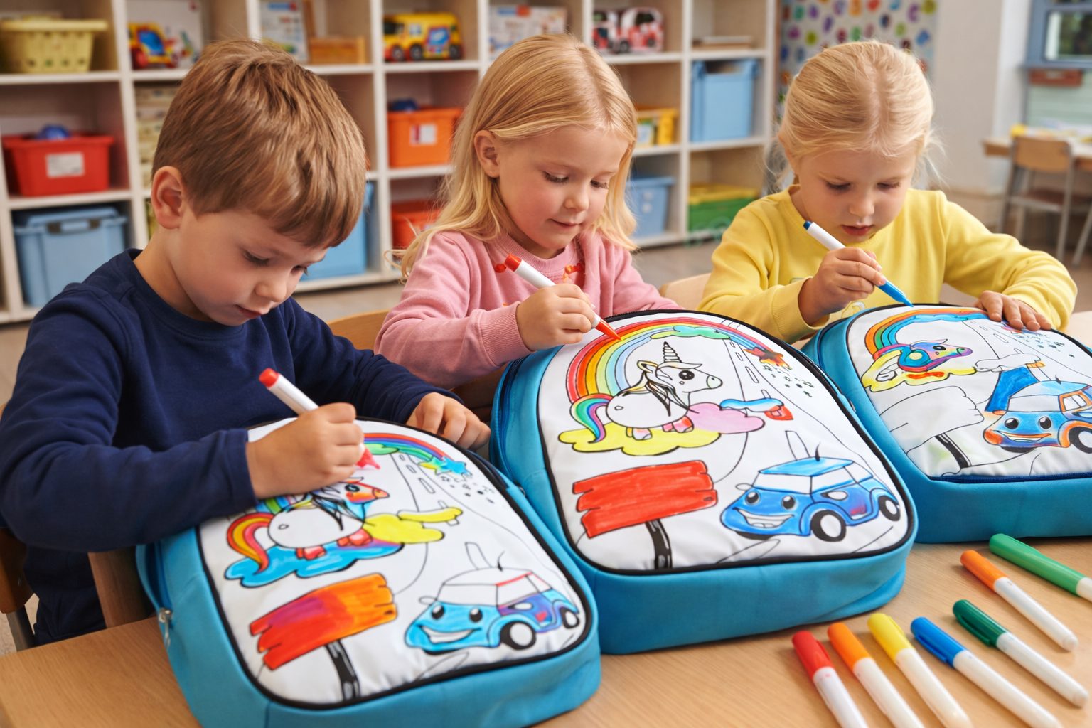 Podczas zajęć dzieci samodzielnie ozdabiają plecak specjalnymi, bezpiecznymi markerami do tkanin. Kolorują gotowy wzór (np. jednorożca), nadając mu własne barwy i charakter – rozwijając wyobraźnię, koncentrację i sprawność manualną. To bardziej ekonomiczna wersja warsztatu „Studio Designu: Mój pierwszy plecak” – kreatywny efekt i radość tworzenia, w niższych kosztach realizacji. Idealna propozycja dla placówek, które chcą zaoferować dzieciom wyjątkową, praktyczną pamiątkę w atrakcyjnej cenie.