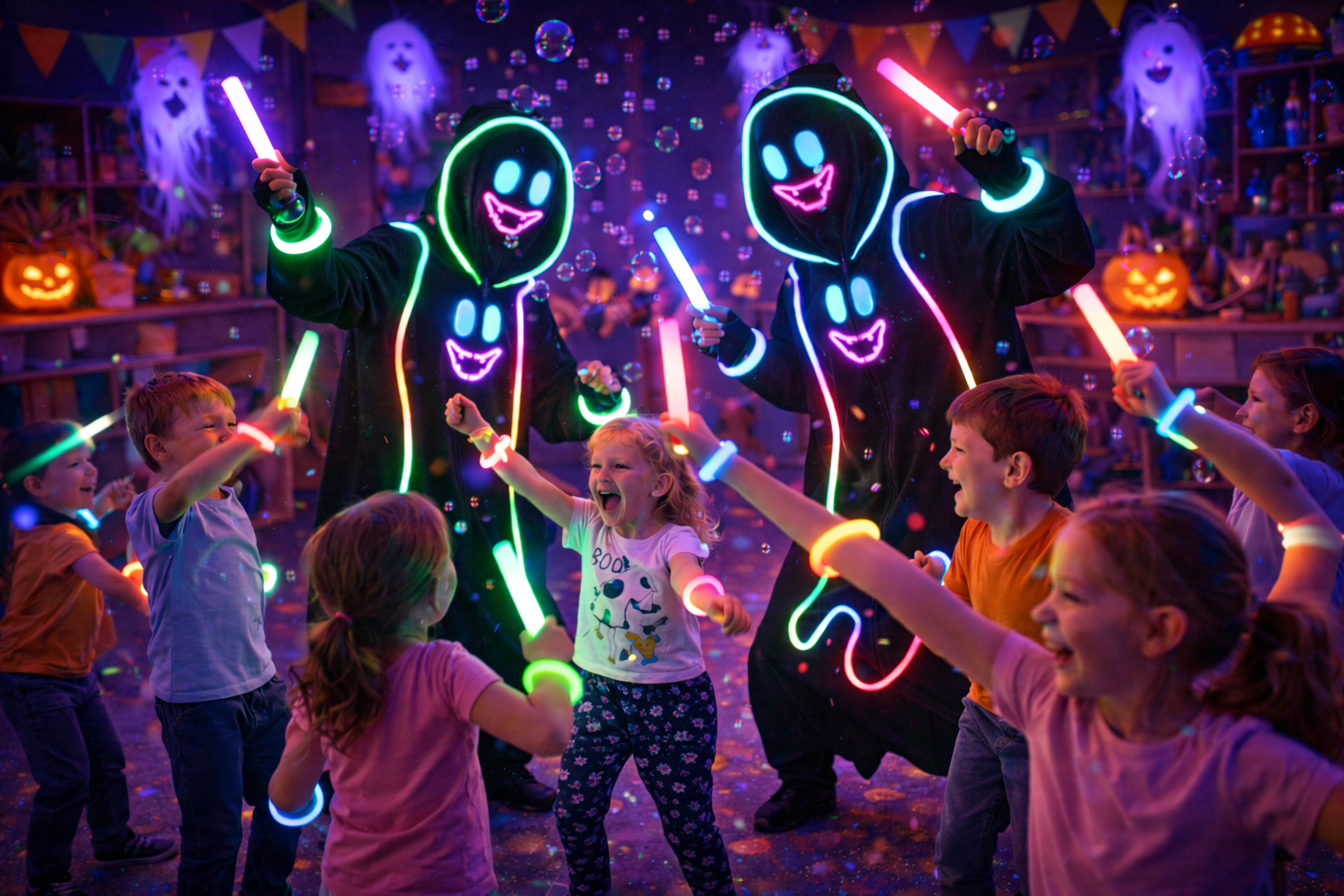 Halloweenowa animacja taneczna z pokazem świecących efektów. To spektakularne Halloween pełne ruchu, muzyki i magicznych efektów świetlnych. Widowiskowy pokaz animatorów, wspólny neonowy taniec i dynamiczne zabawy z wykorzystaniem świecących pałek sprawiają, że dzieci czują się jak bohaterowie prawdziwego halloweenowego show. To energetyczne wydarzenie, które zachwyca i zostaje w pamięci na długo.